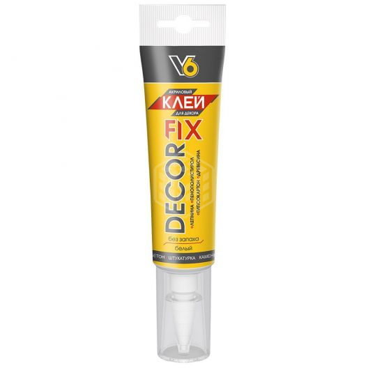 Клей V6 DECOR FIX, акриловый. для декора, белый, 100 г - монтажный клей на основе водной дисперсии акрилового сополимера. Приклеивание различных элементов декора и интерьера на пористые основания - бетон, гипсокартон, древесина штукатурка, кирпич. Рекомендуется для монтажа лепнины, карнизов, молдингов, бордюров, потолочных и стеновых панелей из вспененного пластика, наличников, уголков, легких изделий из ПВХ и ЛДФ. Отлично подходит для изделий из пенополистирола (стиропора), пенополиуретана и пенопласта. Прочная фиксация. Эластичный, влагостойкий. Заделка трещин, щелей и неровностей. Контроль и точность нанесения. Не стекает с вертикальных поверхностей и потолка. Можно шлифовать и окрашивать после высыхания. џ Без запаха и растворителей. Не токсичен, не горюч. Поверхности должны быть сухими, чистыми, тщательно очищены от жира, масла, пыли и других загрязнений. Работы рекомендуется проводить при температуре от +5 до +35 °C. Срезать наконечник тюбика. Клей наносить на основание или приклеиваемый материал полосами или точечно. Плотно и равномерно соединить поверхности. Время корректировки 10- 15 минут. Время полного отверждения – не менее 48 часов. Излишки клея до отверждения очищаются водой, после отверждения – механическим способом.