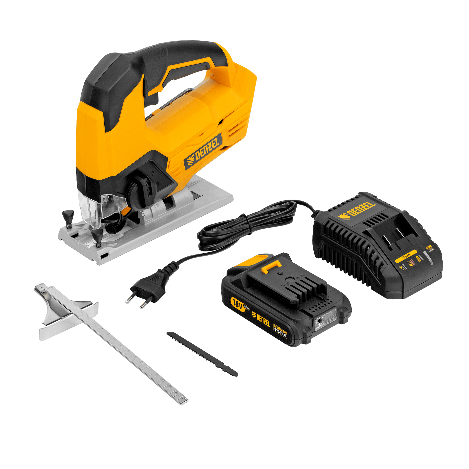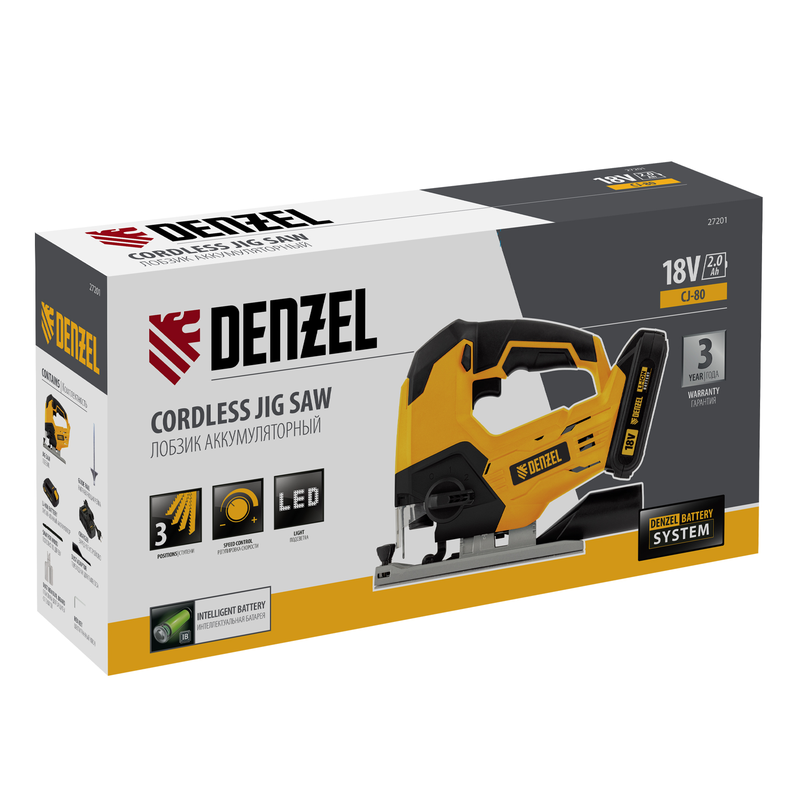 Аккумуляторный лобзик Denzel CJ-80 27201 работает от источника питания Li-Ion с рабочим напряжением 18 В, емкостью 2 А/ч. Предназначен для прямого и фигурного реза листовых материалов из древесины и пластмассы, а также металлических заготовок, ламината, ДСП, ДВП. Максимальная глубина пропила деревянных материалов составляет 80 мм, алюминиевых — 12 мм, стальных — 5 мм. Мощный двигатель позволяет развивать скорость движения оснастки до 2400 ход/мин, что обеспечивает высокую производительность.