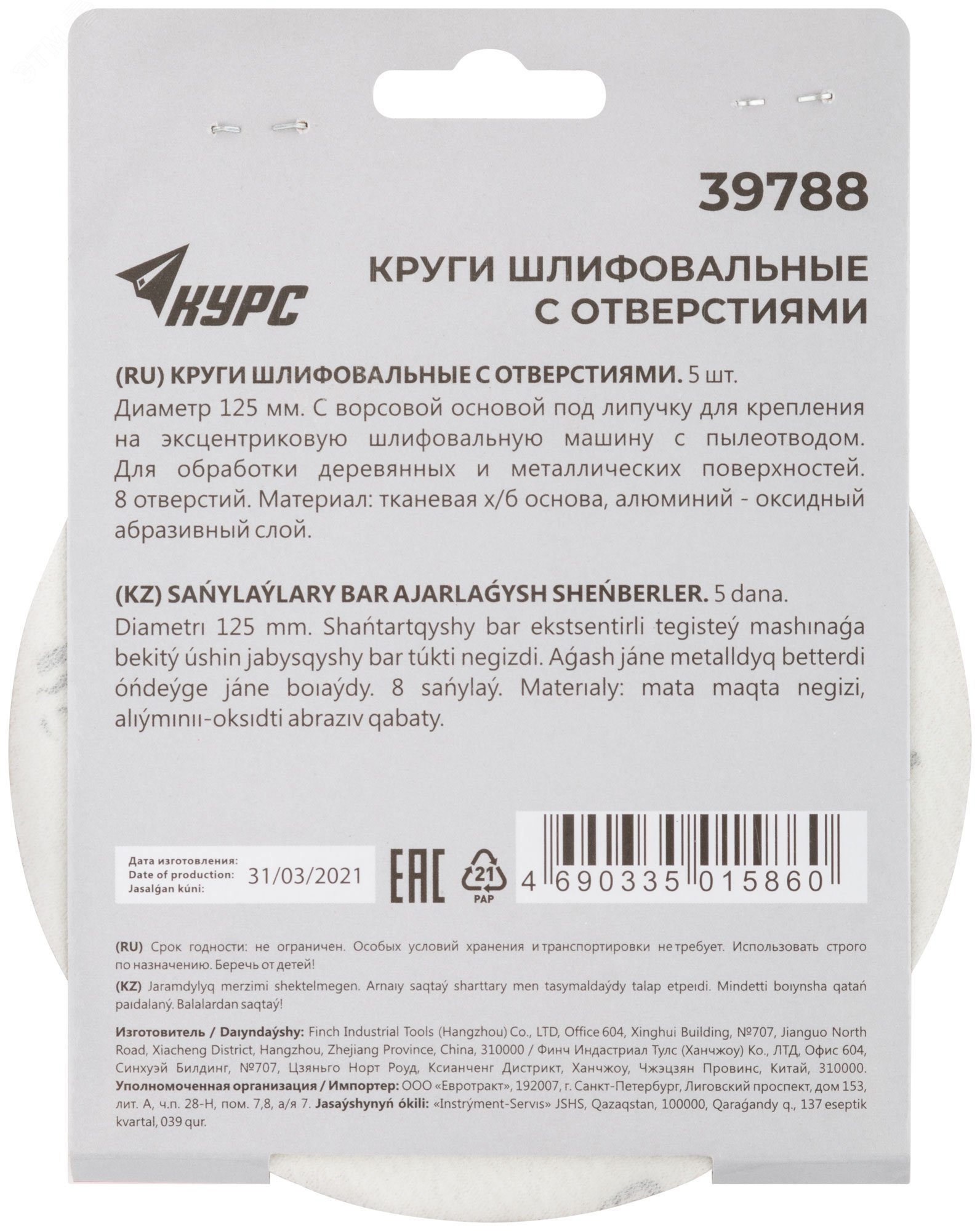 39788 Круги шлифовальные с отверстиями (липучка), алюминий-оксидные, Р180 5шт // 125мм // КУРС