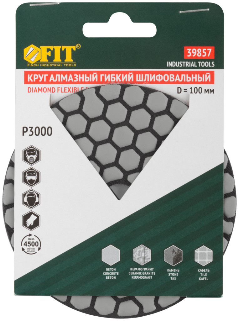 С ворсовой основой под липучку для крепления на шлифовальные диски (опорные тарелки). Для углошлифовальных машин с регулировкой оборотов и электродрелей мощностью не менее 650 Вт. Для шлифования и полирования бетона, мрамора, гранита, керамогранита, кафеля и других изделий. Также применяется для шлифования неровных краев керамической плитки после запила алмазным диском под углом 45° (39851-39854). Может использоваться как с подачей воды, так и без. Материал: полимерная связка, нейлоновая ворсовая основа, рабочая поверхность содержит порошок из технических алмазов. Упаковка: картонный конверт.