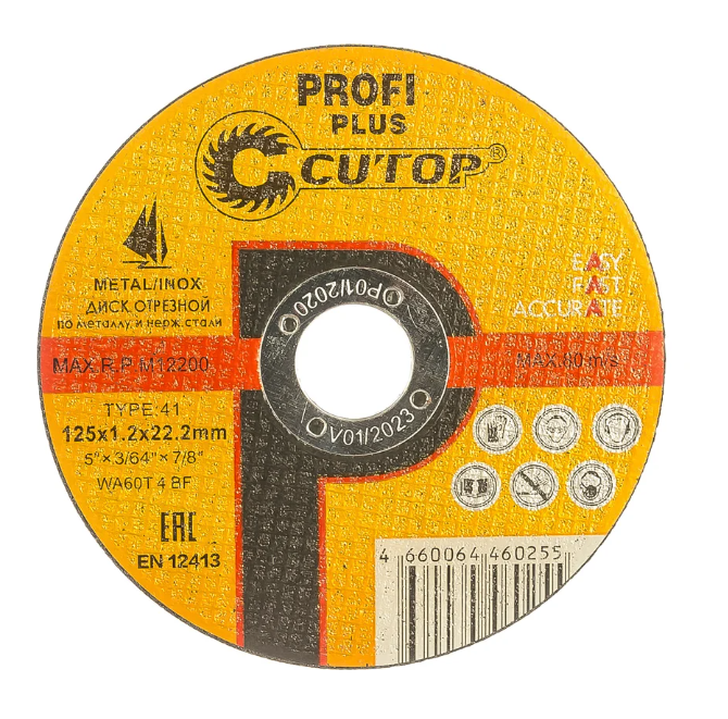 40004т Диск отрезной по металлу и нерж. стали Т41- 125 х 1,2 х 22,2 мм CUTOP Profi Plus предназначен для резки изделий из нержавеющей стали и металла с помощью угловой шлифовальной машины. Изготовлен на основе кубического нитрида бора, что увеличивает срок службы оснастки.