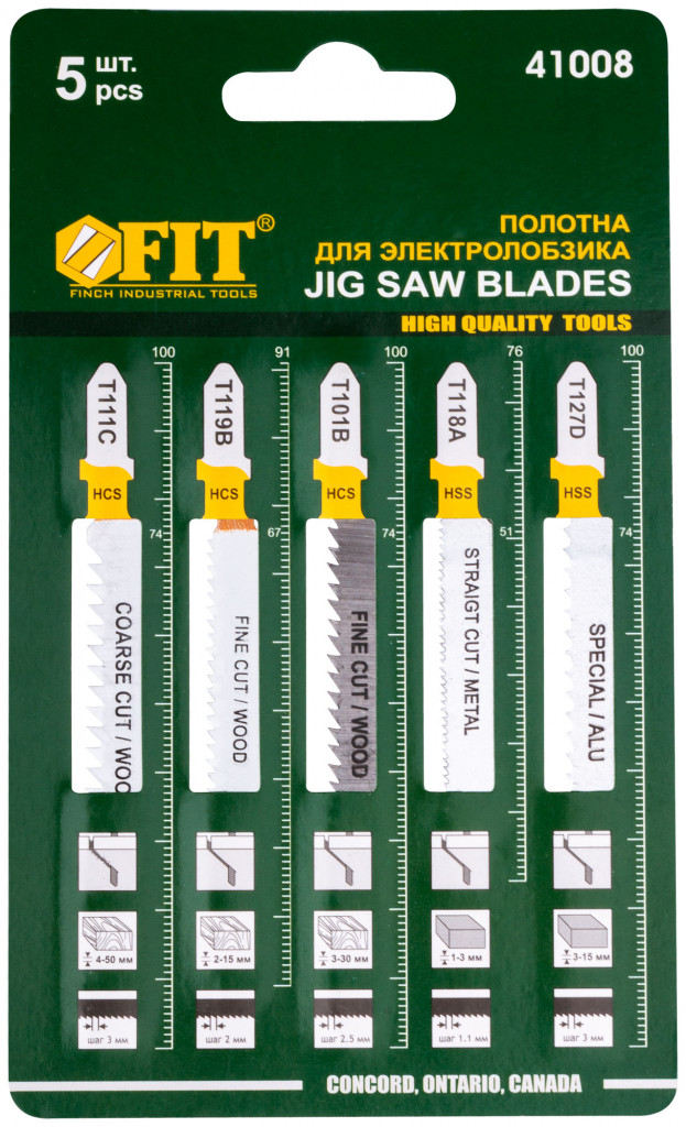 41008 Набор полотен для электро-лобзика 5 шт. (T111C; T119B; T101B; T118A; T127D) FIT