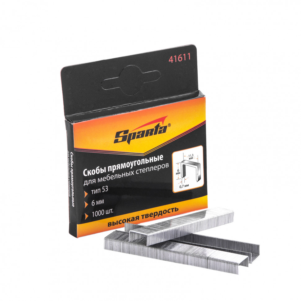 П-образные скобы Sparta 41611 типа 53, размером 6 х 11,3 х 0,7 мм, 1000 шт. в упаковке, заправляются в мебельные степлеры. Подходят для закрепления древесины, фанеры, ДСП, оргалита, картона, и других материалов. Пригодятся для проведения ремонтных и облицовочных работ, а также обивки мебели.