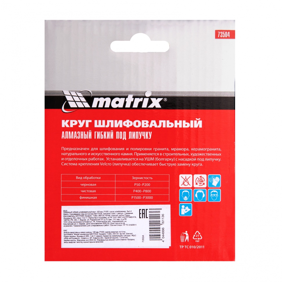 Алмазный гибкий шлифовальный круг Matrix 73504 диаметром 100 мм, с зернистостью P 800, предназначен для сухого шлифования гранита, мрамора, природного и искусственного камня, керамогранита. Используется на преимущественно на цветных и черных поверхностях. Абразив с зернистостью P 800 снимает тонкий слой материала и применяется для чистового шлифования. Гибкость круга упрощает обработку предметов сложной формы. Круг используется на УШМ с установленной опорной тарелкой для АГШК.