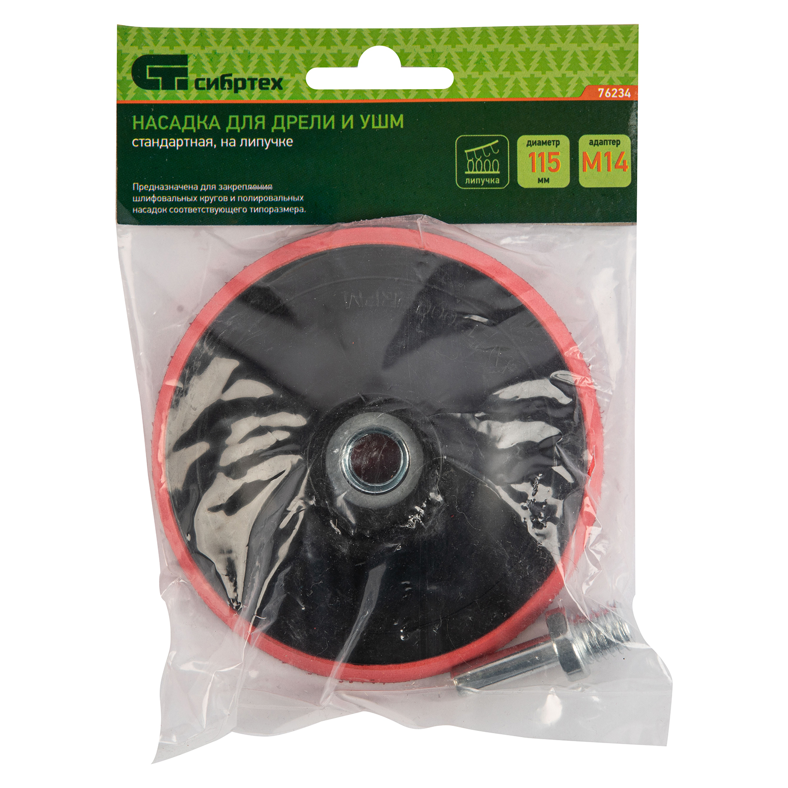 Насадка (опорная тарелка) ТМ Сибртех 76234 предназначена для проведения шлифовальных и полировальных работ с помощю абразивных кругов и полировальных насадок с креплением velcro (под липучку) соответствующего типоразмера.