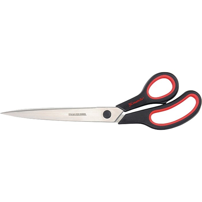 Хозяйственные ножницы Matrix 79134 длиной 280 мм, с двухкомпонентными рукоятками, используются для разрезания бумаги, картона, тканей и других материалов. Рукоятки изогнуты, что облегчает выполнение длинных продольных разрезов, например, при раскройке обоев. Инструмент применяется в быту.