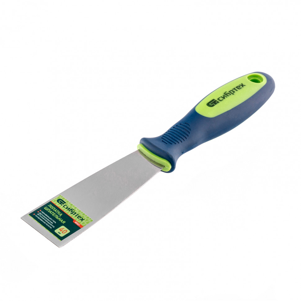 Шпательная лопатка Сибртех из нержавеющей стали 85521, шириной 40 мм, с 2-компонентной ручкой, облегчает проведение ремонтно-отделочных работ. Позволяет наносить и разравнивать строительные смеси, шпаклевать швы, заполнять трещины, удалять старые обои и выполнять работы в труднодоступных местах.