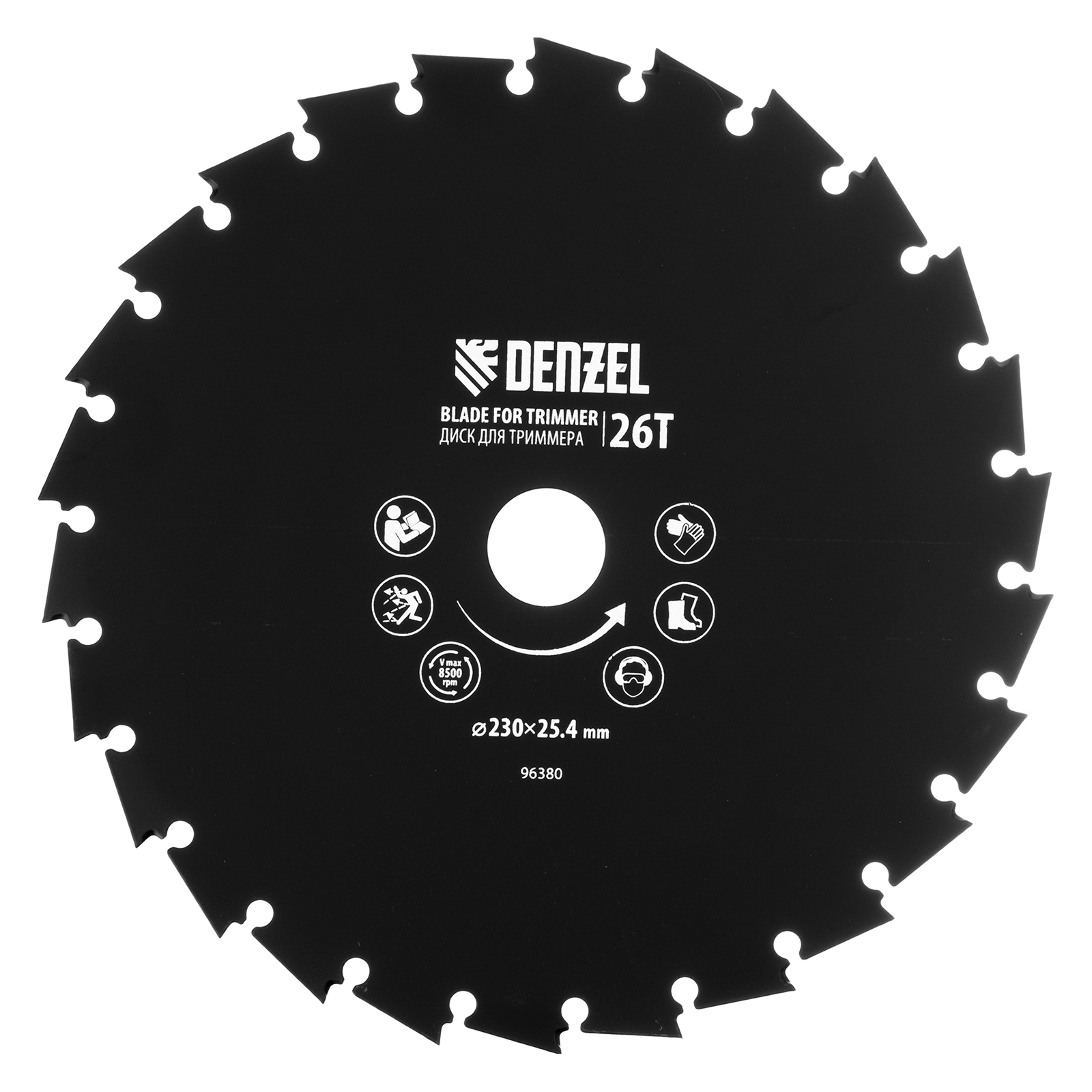 Диск для триммера Denzel 96380 с внешним диаметром 230 мм и посадочным — 25,4 мм, с 26 зубьями долотообразной формы, предназначен для скашивания травы и мелкого кустарника. Устанавливается на вал триммера с бензиновым двигателем. Диск пригодится для ухода за дачным участком.