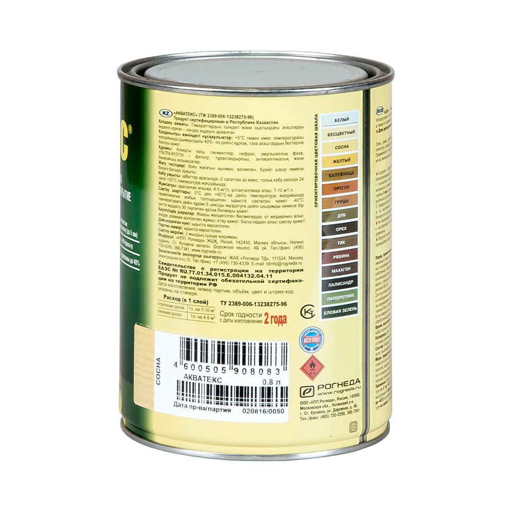 Состав алкидные смолы, нефрас, эмульсионная фаза, высокоэффективные трудновымываемые биоцидные добавки, светостойкие пигменты, УФ-фильтр UVA-диапазона, стабилизатор