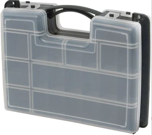 Выполнен в форме кейса, служит для хранения и переноски крепежа и мелких деталей. Состоит из множества отделений, где удобно размещаются необходимые аксессуары и различные мелочи. Прозрачная крышка позволяет видеть расположение крепежа внутри. Пластиковые защелки надежно защищают чемоданчик от непреднамеренного открывания.