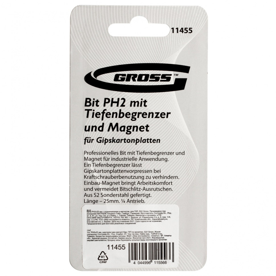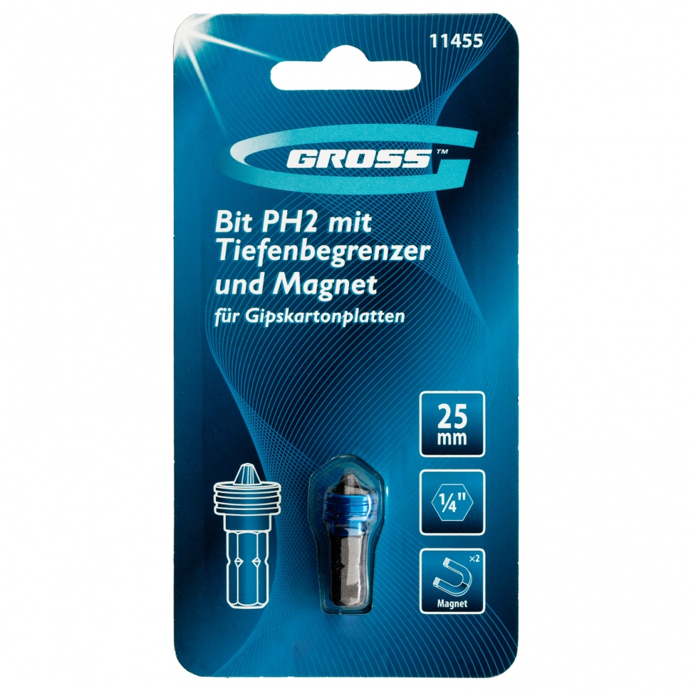 Бита Gross 11455 типоразмера PH2 x 25 мм, из стали S2, c ограничителем и магнитом, оптимально подходит для монтажа и демонтажа саморезов в гипсокартонные листы. Используется в качестве оснастки для шуруповертов и отверток. Благодаря встроенному ограничителю хода крепеж ввинчивается на необходимую глубину, что позволяет избежать повреждения материалов и экономит время мастера.