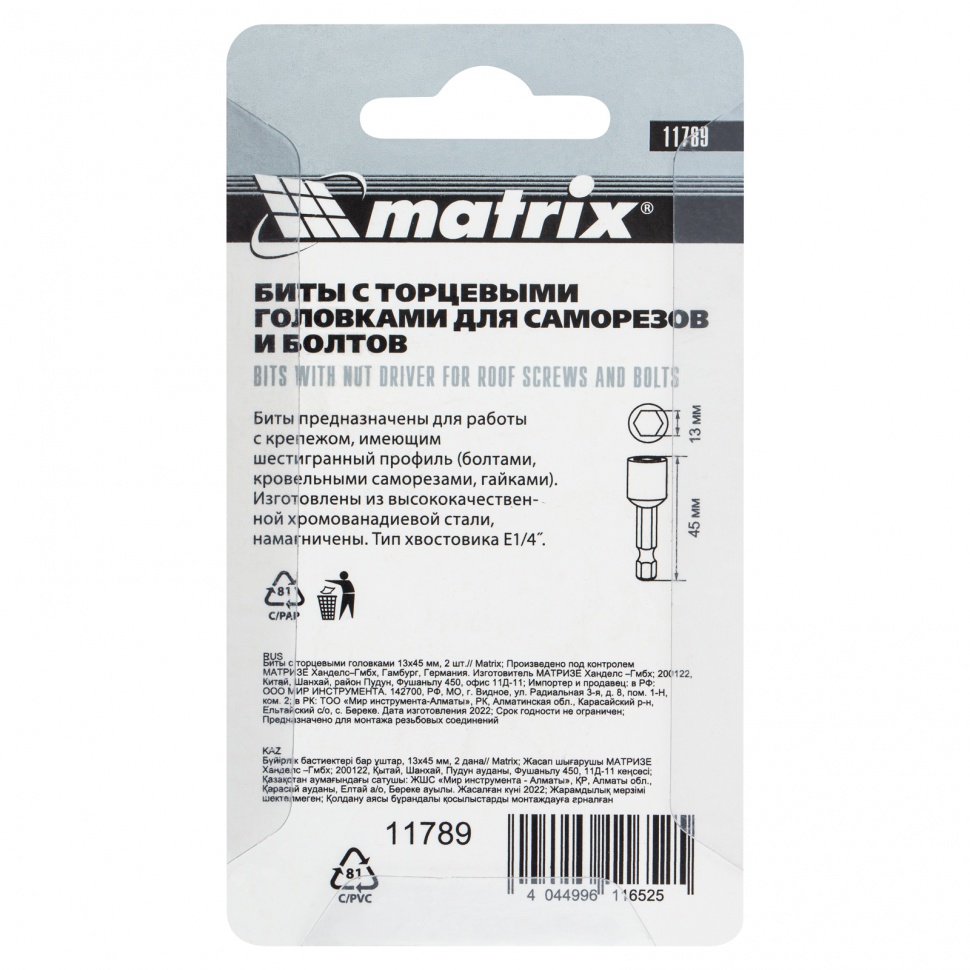 Биты с торцевыми головками 13 мм, 45 мм, 2 шт. Matrix