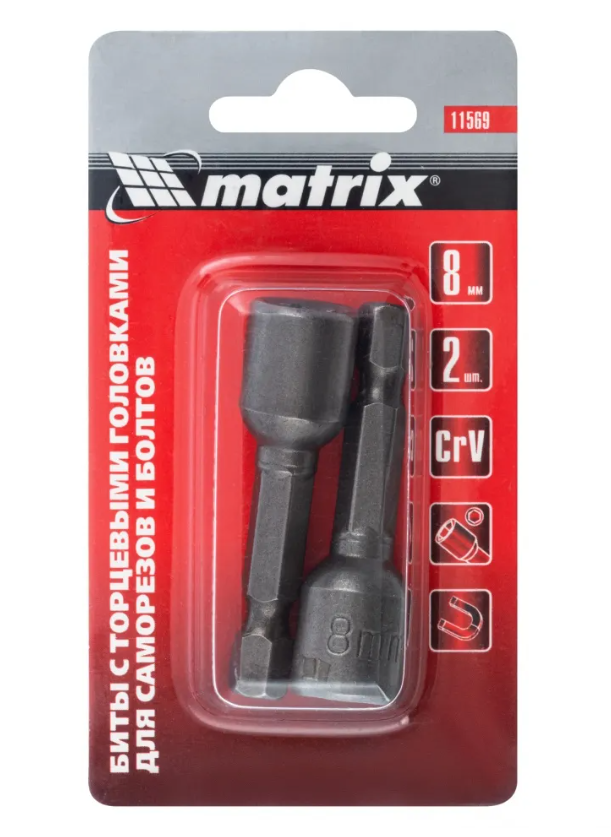 Биты с торцевыми головками Matrix 11569 размером 8 х 45 мм, 2 шт. в уп., предназначены для работ с шуруповертом. Используются при монтаже и демонтаже болтов и шурупов, а также кровельных саморезов с внешним шестигранником. Увеличенная длина 45 мм облегчает работу в труднодоступных местах. Биты способны полностью заменить торцевые головки, особенно если под рукой нет трещотки.