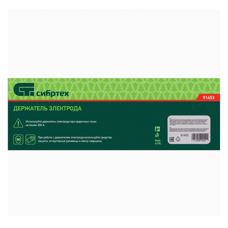 Держатель электродов Сибртех 91453 совместим со сварочными аппаратами с силой тока до 300 A. Используется для удержания электрода в нужном положении и подведения к нему тока в процессе сварочных работ. Работает с электродами диаметром до 6,3 мм.