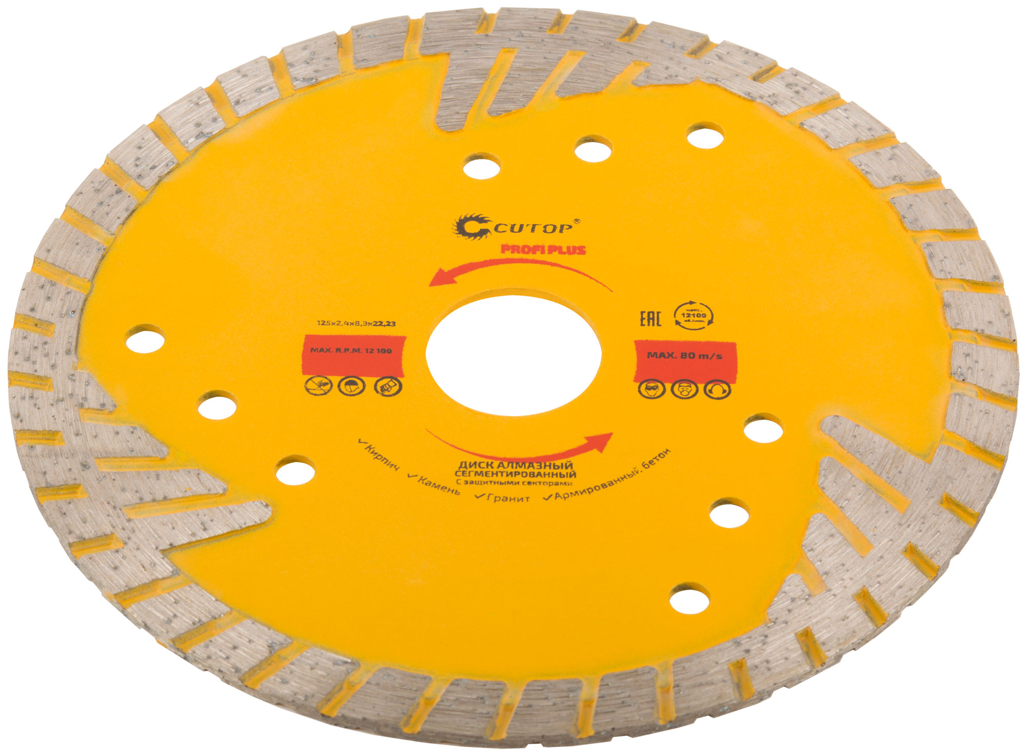 Для резки армированного бетона, керамической плитки, гранита, кирпича, камня. Посадочный диаметр 22,2 мм. Защитные сектора диска обеспечивают защиту режущего слоя отбокового износа. Диски характеризуются повышенной концентрацией алмазов, улучшенным качеством алмазных зерен и оптимально подобранной металлической связкой. Эти преимущества обеспечивают высокую производительность и увеличенный срок службы
