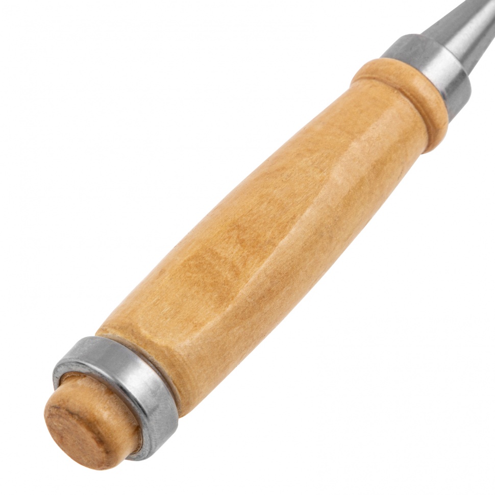 Плоское долото-стамеска 6 мм с деревянной рукояткой предназначено для столярных и плотничных работ- выборка и зачистка небольших прямоугольных пазов, снятия фасок в натуральной древесине любой твердости.Полотно стамески выполнено из конструкционной стали 45 и остро заточена. Твердость инструмента на длине 0,7 рабочей части полотна составляет 45-55 HRC. Рукоятка имеет защитное лакокрасочное покрытие и оборудована металлическим кольцом с тыльной стороны, которое предотвращает раскол дерева при ударах молотком или киянкой.
