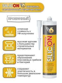 Силиконовый герметик V6 универсальный бесцветный 260 мл применяется как в быту, так и строительстве для заделки швов, уплотнения стыков и герметизации поверхностей, соприкасающихся с водой. Эластичный шов устойчив к перепадам температур, выдерживает деформацию и вибрацию.