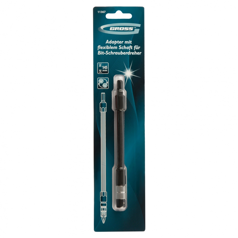 Гибкий переходник для бит Gross 11367 длиной 145 мм, 1/4 дюйма, облегчает монтаж и демонтаж резьбовых соединений в труднодоступных местах. Он позволяет работать со стандартными битами, легко меняя их. Используется с шуруповертом.