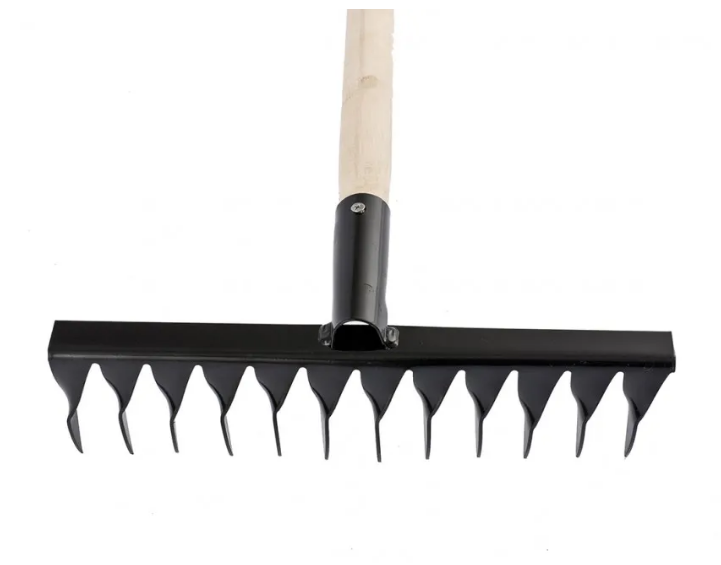 Рабочая часть и тулейка изготовлены из конструкционной углеродистой стали, а зубья утолщены, поэтому грабли выдерживают большие нагрузки.