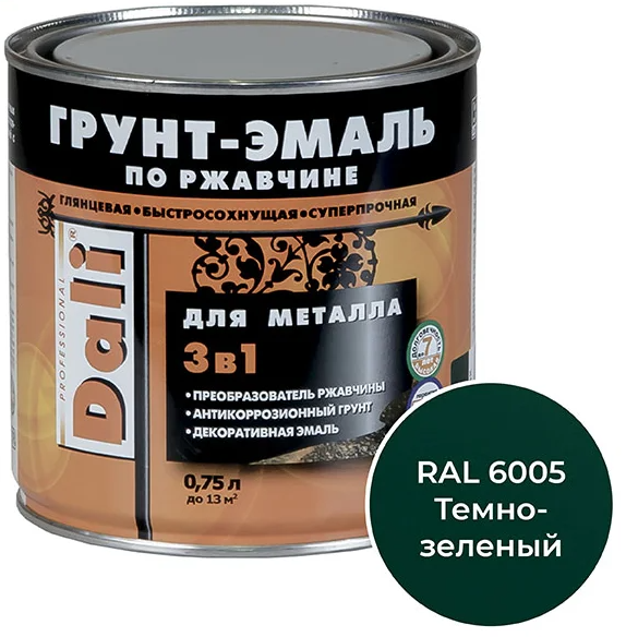 ГРУНТ- ЭМАЛЬ ПО РЖАВЧИНЕ "DALI" 3 В 1, глянцевая, ЗЕЛЕНЫЙ МОХ (RAL 6005) 2 Л (3) "РОГНЕДА"