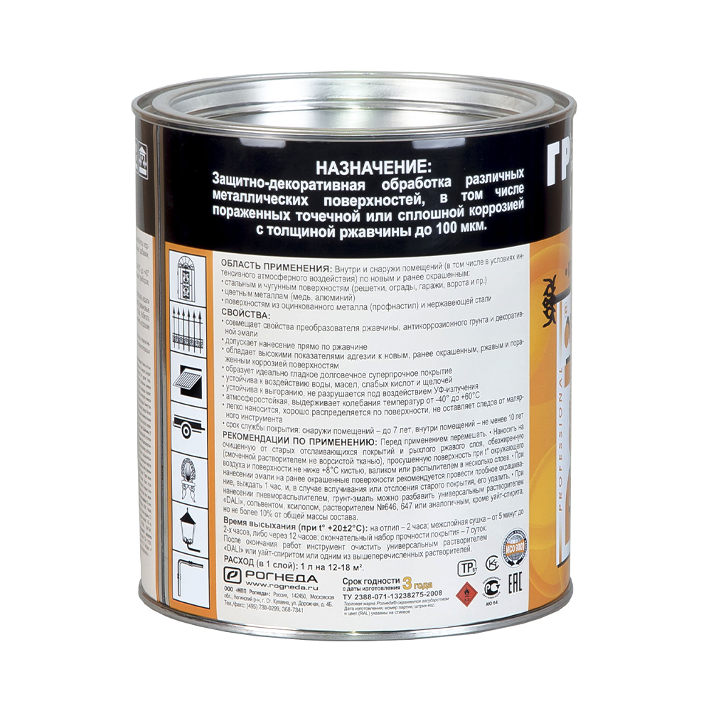 Состав: модифицированная алкидная смола, восстановитель металла, ингибитор коррозии, пигменты, наполнитель, антикоррозионные и функциональные добавки, растворитель.