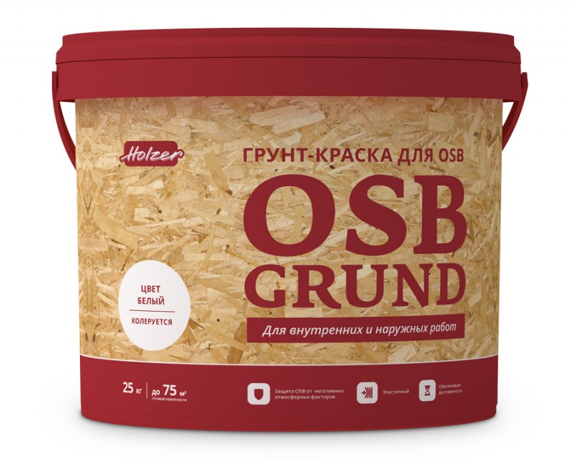 Грунт-краска Holzer OSB Grund предназначен для предварительной обработки ориентированно-стружечных плит перед нанесением декоративных штукатурок и других покрытий, а также защиты от негативного воздействия влаги, атмосферных осадков, УФ-излучения в период эксплуатации OSB без покрытия. Может наноситься на пенополистирольные плиты и ДСП.