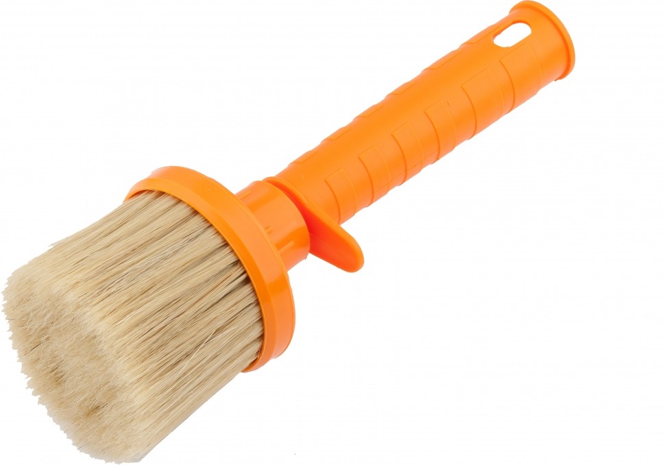 Рабочая часть кисти изготовлена из натуральной щетины двойной проварки, обеспечивающей отличное распределение краски по поверхности, за счет чего достигается высокое качество покраски.