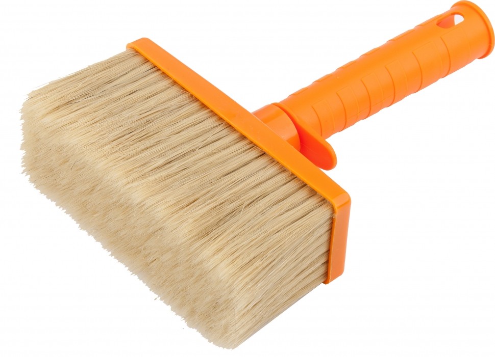 Рабочая часть кисти изготовлена из натуральной щетины двойной проварки, обеспечивающей отличное распределение краски по поверхности, за счет чего достигается высокое качество покраски.