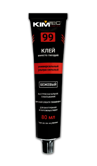 KIM TEC 99 клей вместо гвоздей универсальный экстра сильный - является однокомпонентным клеем на основе растворителей на базе бутадиен-стиролового каучука (SBS). Клей предназначен для отделочных работ внутри и снаружи помещений в строительстве. Образует эластичный водостойкий шов. KIM TEC 99 клей вместо гвоздей характеризуется: -не содержит толуол, -обладает высокой клеящей способностью, -образует прочный и долговечный шов, -отличная адгезия к большинству строительных материалов, -можно применять для пенополистирола. KIM TEC 99 клей вместо гвоздей пригоден для приклеивания: -бордюров, -панелей, -древесины, -плит из пластмасс, -керамических плиток, -подоконников, -твердого ПВХ, -стекла, -металлов и металлических листов -ко всем типам оснований, применяемым в строительстве: бетону, кирпичу, гипсу, штукатурке. Способ применения: Подготовка поверхности: Поверхность должна быть выровнена, тщательно вымыта, очищена от пыли и других загрязнений, таких как ржавчина и маслосодержащие продукты. Чтобы добиться требуемой адгезии, необходимо удалить все старые настенные покрытия. Нанесение: Oбрежьте наконечник чуть выше резьбы под углом 45 градусов и наденьте насадку. Вставьте картридж с клеем в пистолет. Нанести клей точками или полосками на одну из поверхностей. Для равномерного распределения клея приложить склеиваемые поверхности друг к другу и разъединить их на 4-8 минут. Соединить и сильно прижать друг к другу склеиваемые поверхности. Хранение и срок годности: Срок хранения 24 месяца от даты производства в оригинально закрытой упаковке при температуре от +5°С до +25°С.