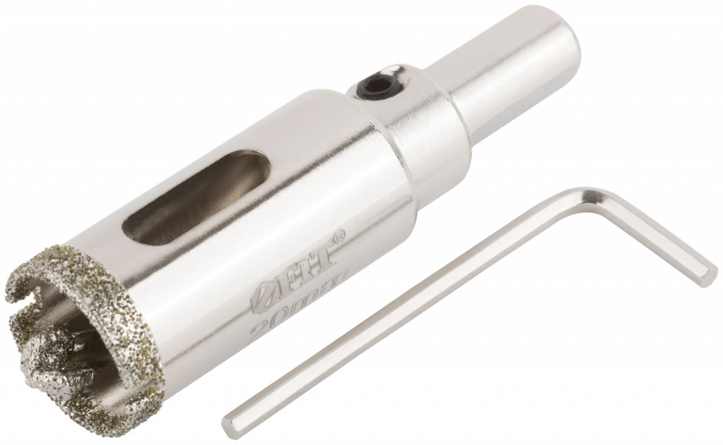 Трехгранный хвостовик. Идут в комплекте с центрирующим сверлом и шестигранным ключом. Для вырезания круговых отверстий в керамограните, камне, стекле, кафельной плитке. Влажное сверление. Глубина пропила 40 мм. Материал: инструментальная сталь, режущая кромка содержит порошок из технических алмазов.