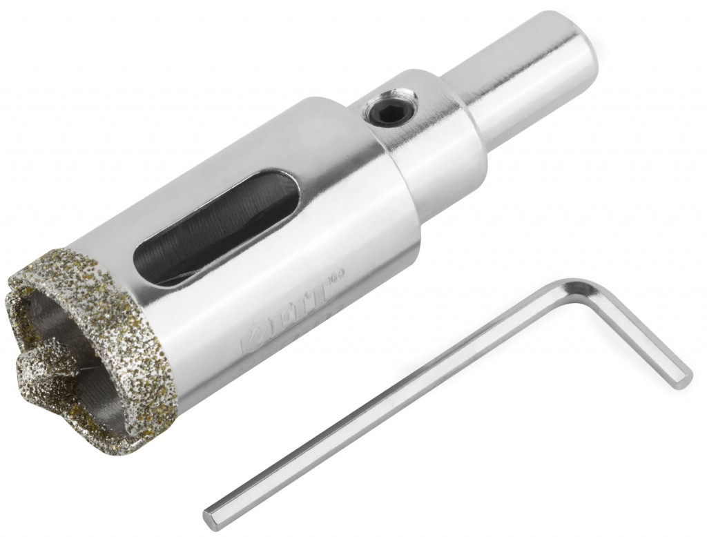 Трехгранный хвостовик. Идут в комплекте с центрирующим сверлом и шестигранным ключом. Для вырезания круговых отверстий в керамограните, камне, стекле, кафельной плитке. Влажное сверление. Глубина пропила 40 мм. Материал: инструментальная сталь, режущая кромка содержит порошок из технических алмазов. Упаковка: блистер.