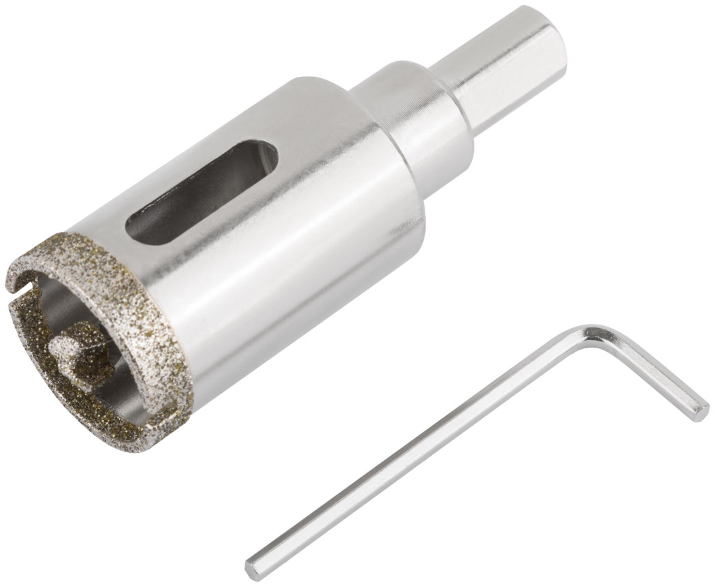 Трехгранный хвостовик. Идут в комплекте с центрирующим сверлом и шестигранным ключом. Для вырезания круговых отверстий в керамограните, камне, стекле, кафельной плитке. Влажное сверление. Глубина пропила 40 мм. Материал: инструментальная сталь, режущая кромка содержит порошок из технических алмазов.