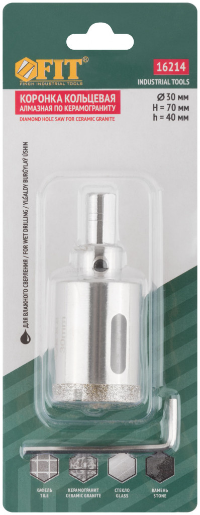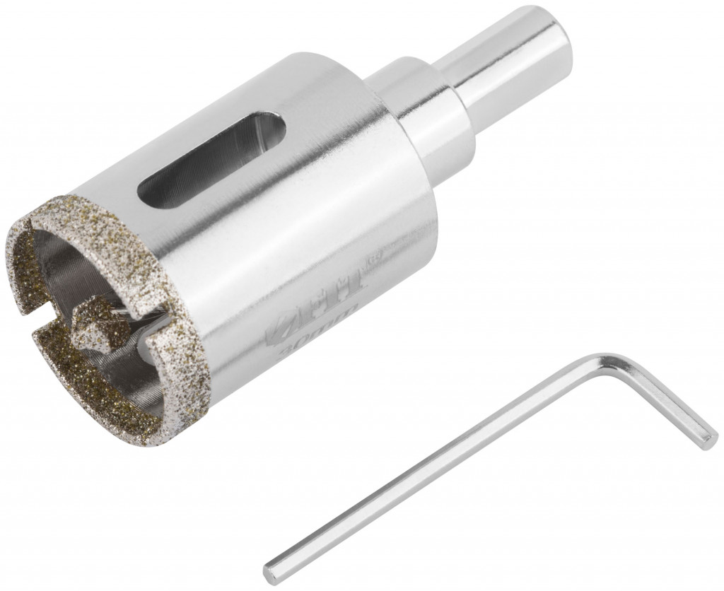Трехгранный хвостовик. Идут в комплекте с центрирующим сверлом и шестигранным ключом. Для вырезания круговых отверстий в керамограните, камне, стекле, кафельной плитке. Влажное сверление. Глубина пропила 40 мм.
