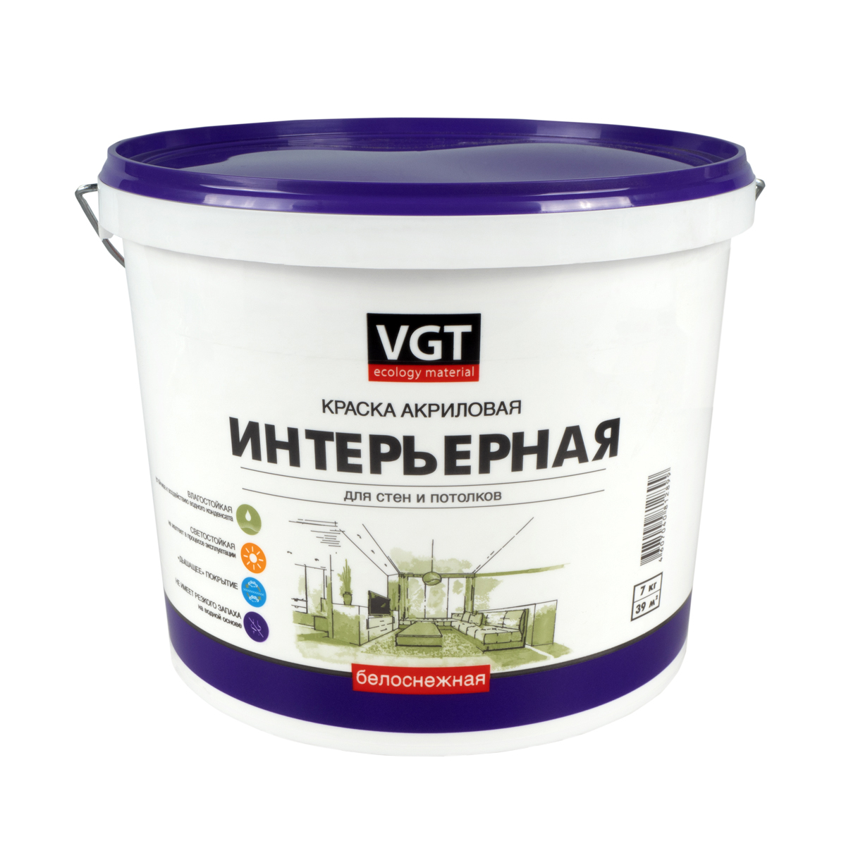 Краска интерьерная для стен и потолков VGT ВД-АК-2180, акриловая, белоснежная, 7 кг