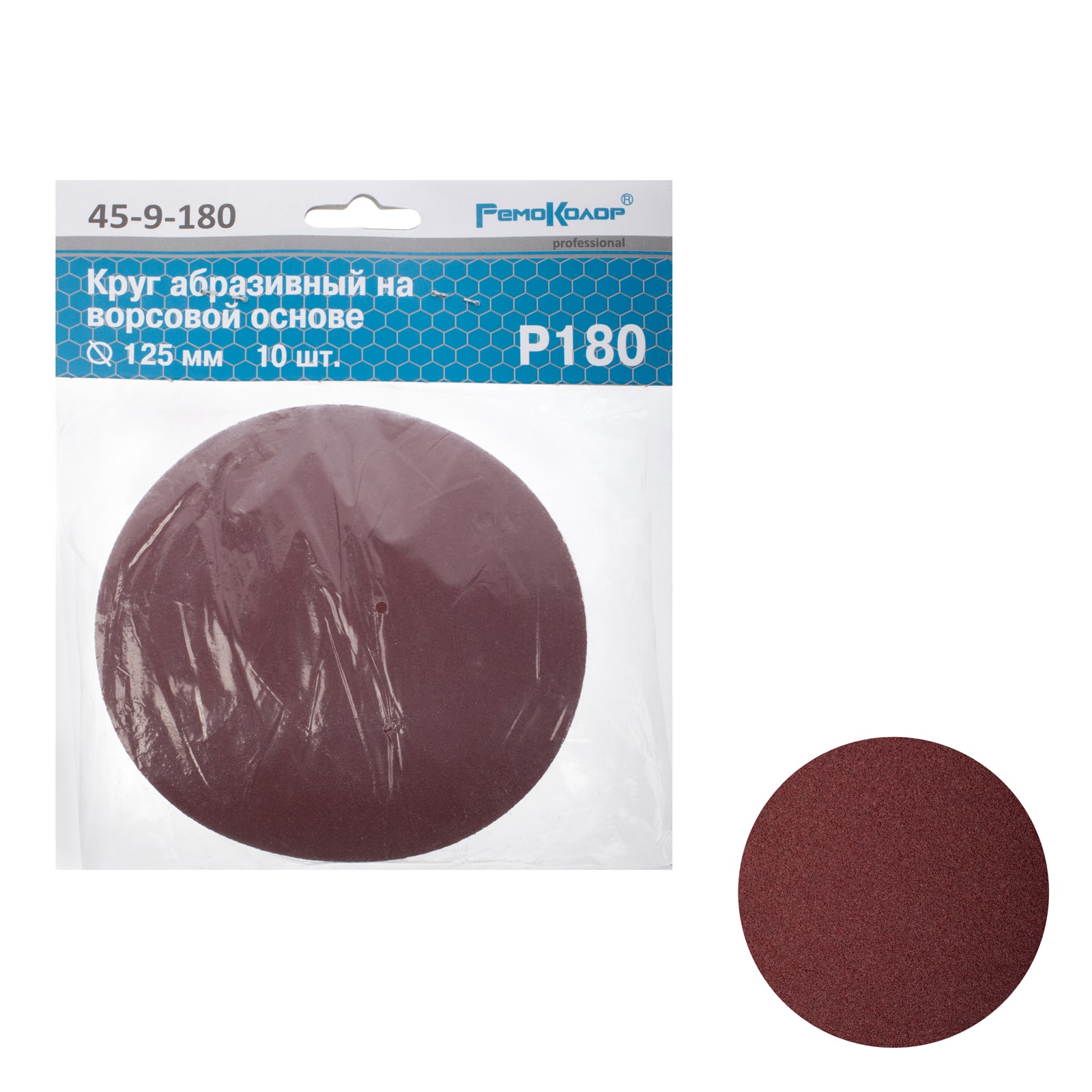 Круг абразивный на ворсовой подложке, под липучку, оксид алюминия, Р180, 125мм 10шт., (уп.)---
