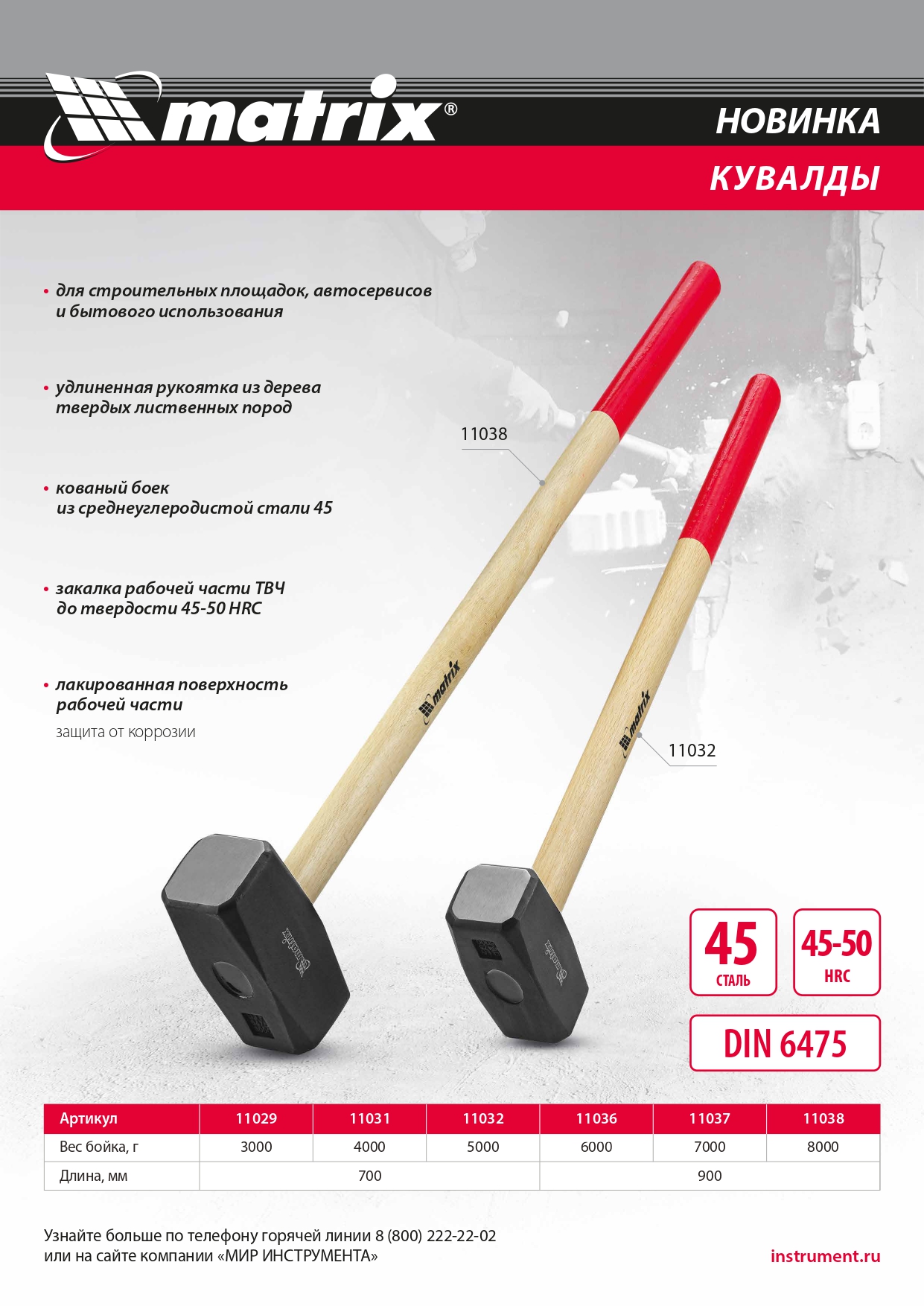 Устойчивость к деформации при ударных нагрузках — голова изготовлена из среднеуглеродистой стали 45, рабочие поверхности закалены токами высокой частоты до твердости 40-45 HRC.