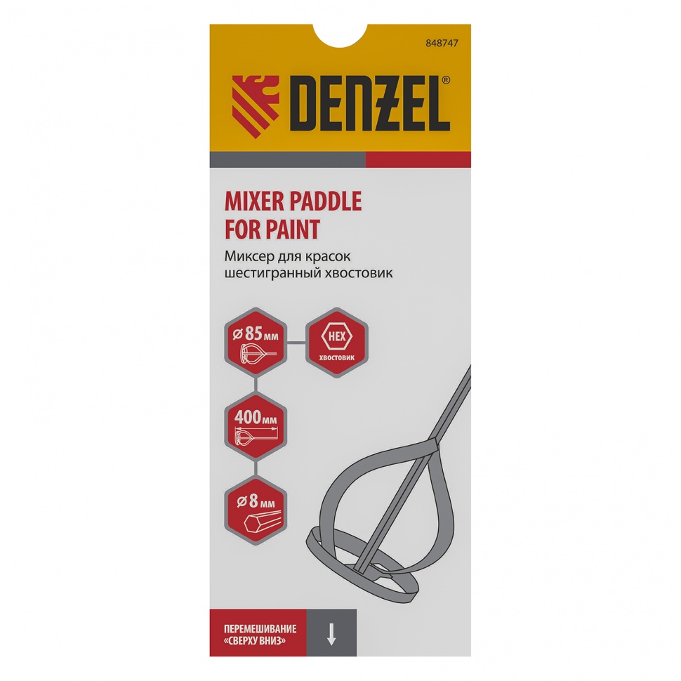 Миксер для красок Denzel 848747, 85 х 8 х 400 мм, с шестигранным хвостовиком, — насадка-венчик для электроинструмента, обеспечивающая равномерное перемешивание жидких строительных растворов, например, лакокрасочных материалов, морилок, штукатурно-клеевых смесей. Благодаря продуманной конструкции успешно справляется с поставленными задачами. На конце венчика имеется защитное кольцо, предохраняющее емкость, в которой размешивают раствор, от повреждений. Насадка используется во время отделочных работ.