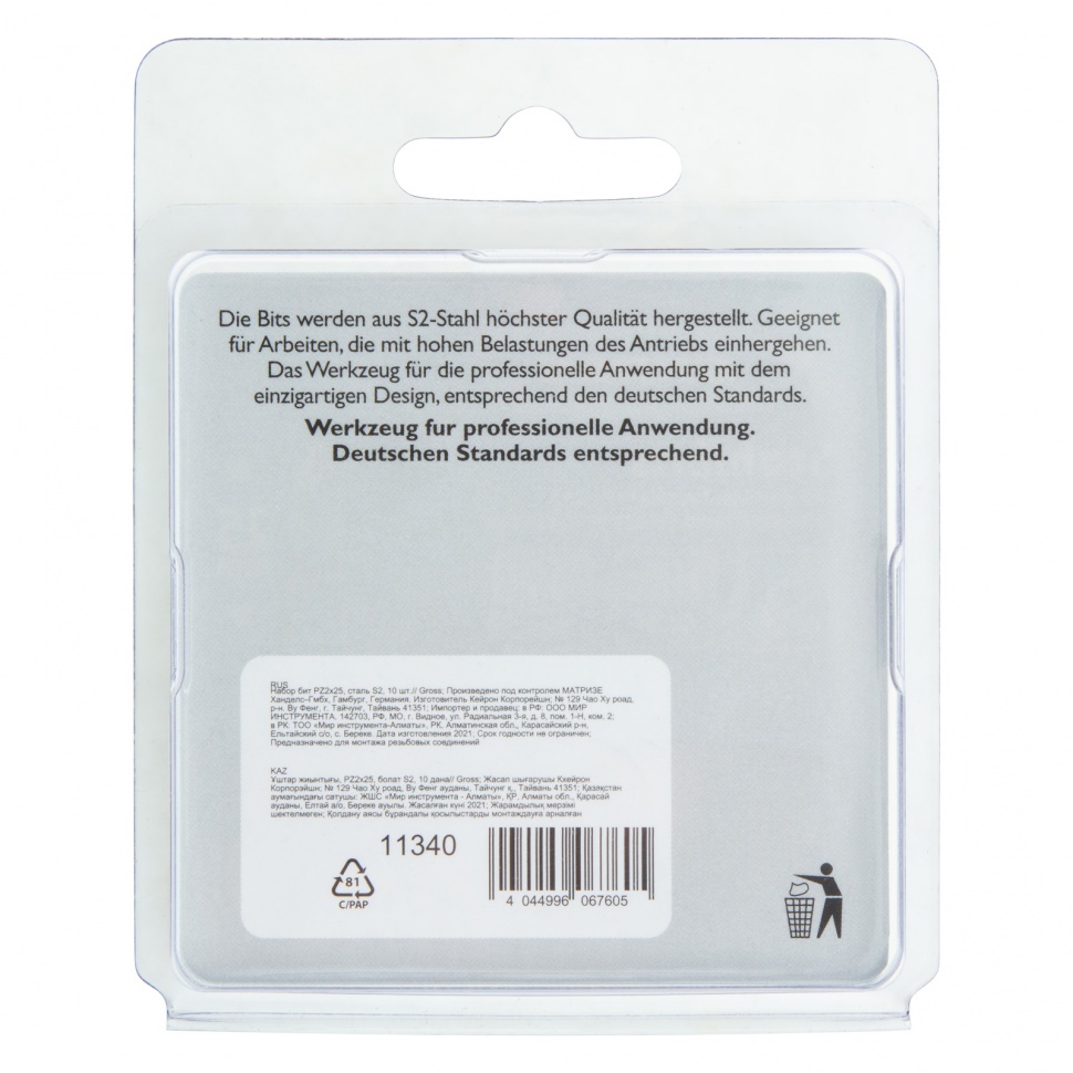 Набор бит Gross 11340 состоит из 10 насадок типоразмера PZ2 и длиной 25 мм, с хвостовиком 1/4 дюйма, изготовленных из стали S2 и предназначенных для шуруповертов. Оснастки служат для монтажа и демонтажа шурупов, саморезов и других резьбовых соединений. Шлиц PZ имеет 4 дополнительных ребра, благодаря чему предотвращается проскальзывание биты в крепеже, повышаются точность и эффективность работ.