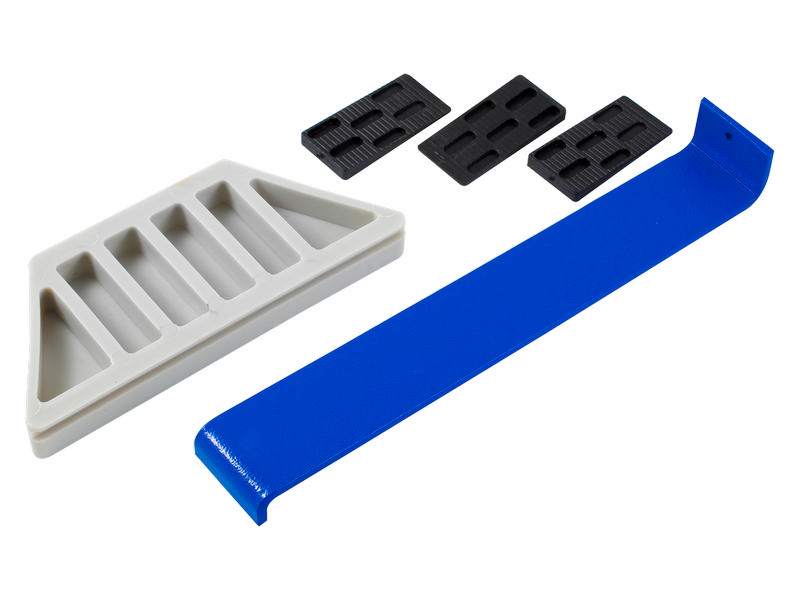 Использование набора снижает вероятность повреждения материала и улучшает качество укладки. В наборе присутствуют пластиковые клинья (30 шт), пластиковый брусок, монтажная скоба. Регулировка расстояния между ламинатными панелями и стеной обеспечивается с помощью пластиковых клиньев. Пластиковый брусок предназначен для подбивки деталей напольного покрытия с целью их более плотного прилегания друг к другу. Монтажная скоба используется для подбивки напольного покрытия при его укладке вдоль стен, не повреждая замки и поверхность изделия.