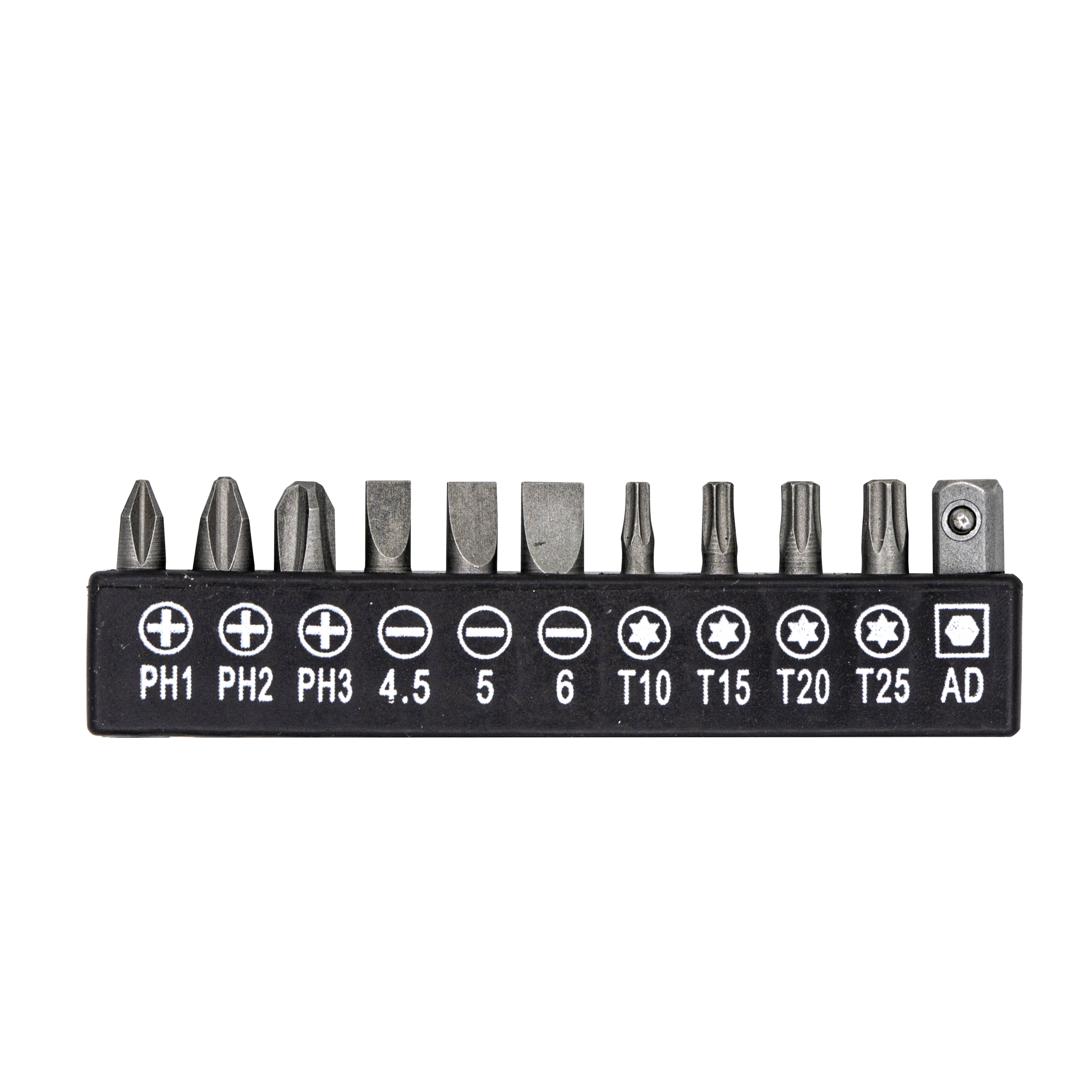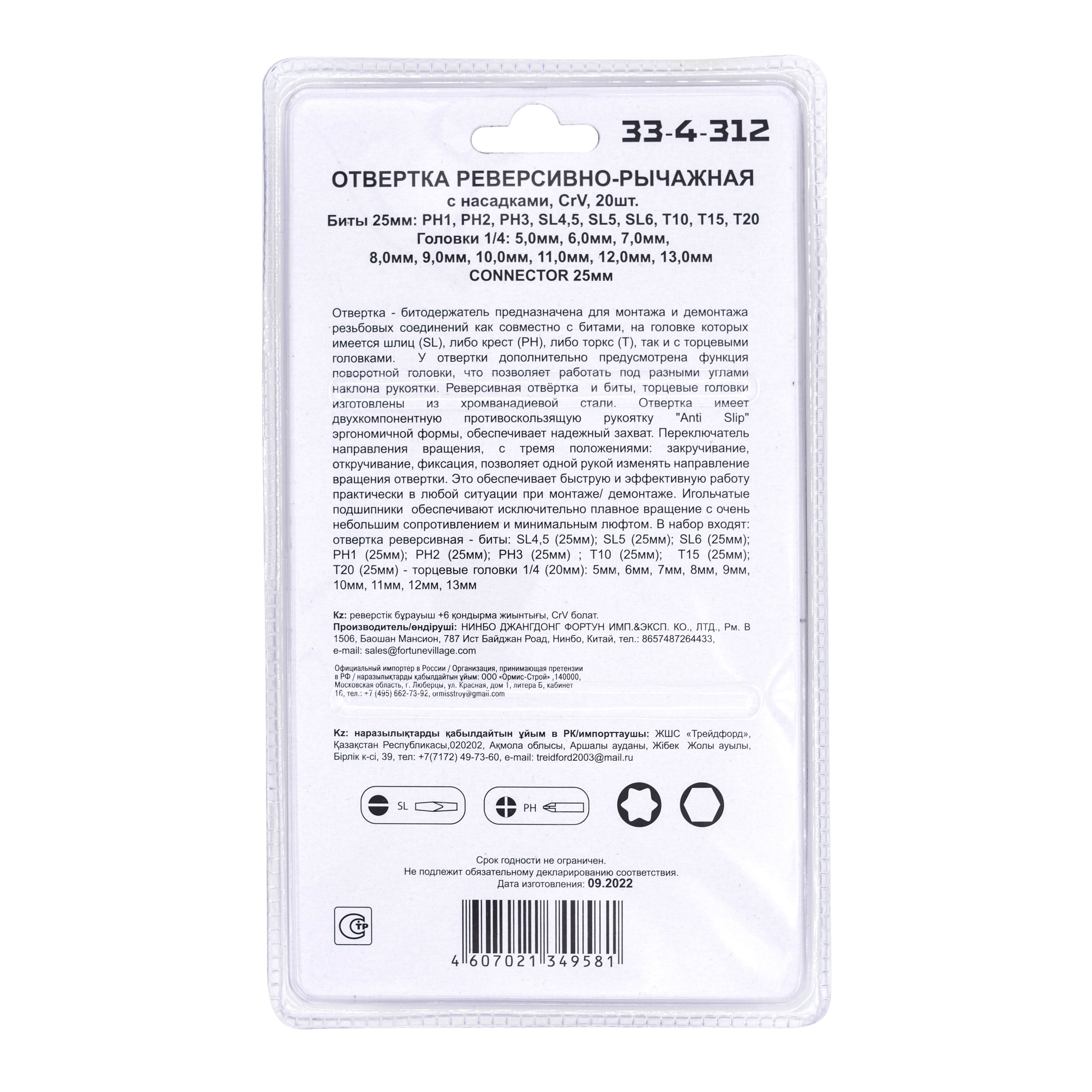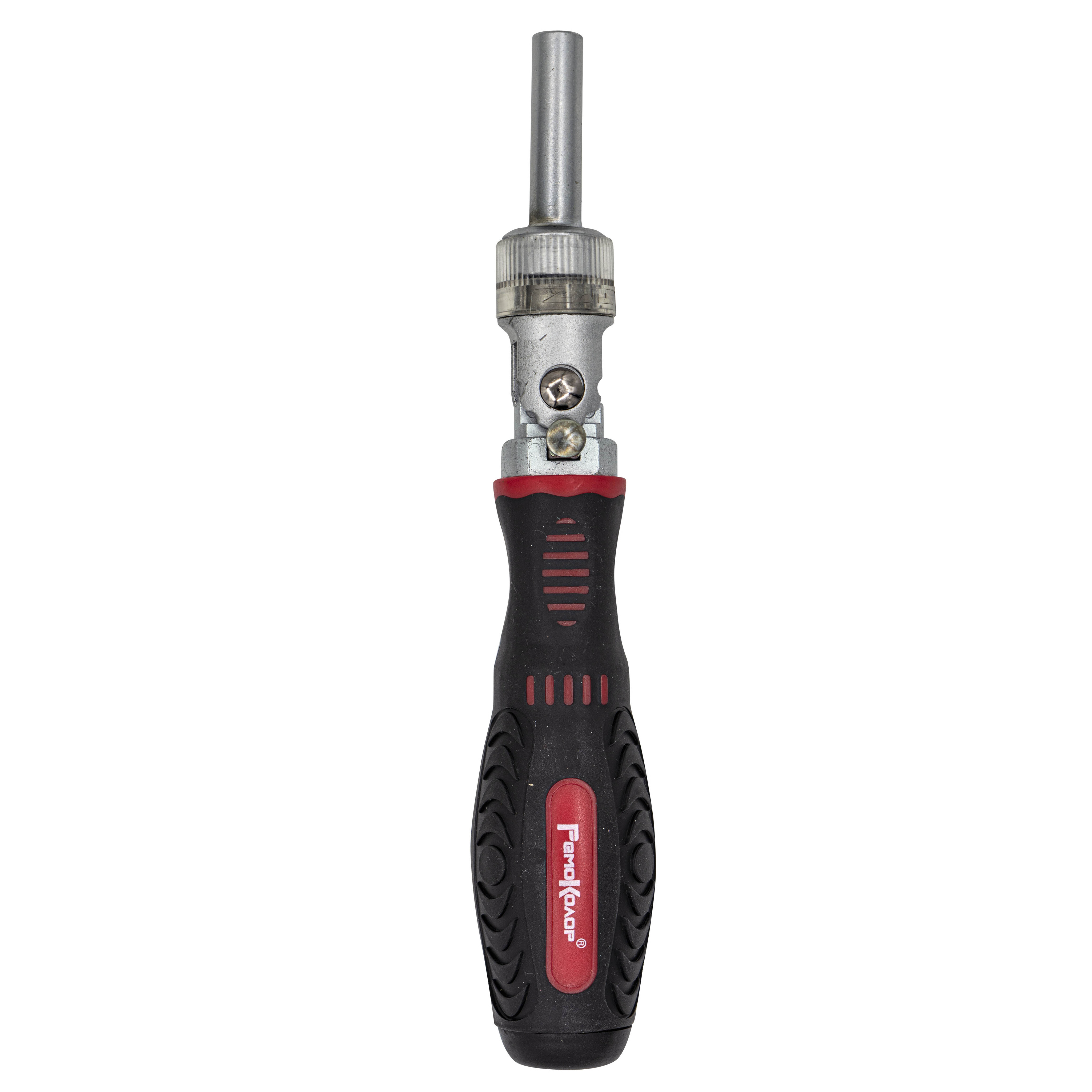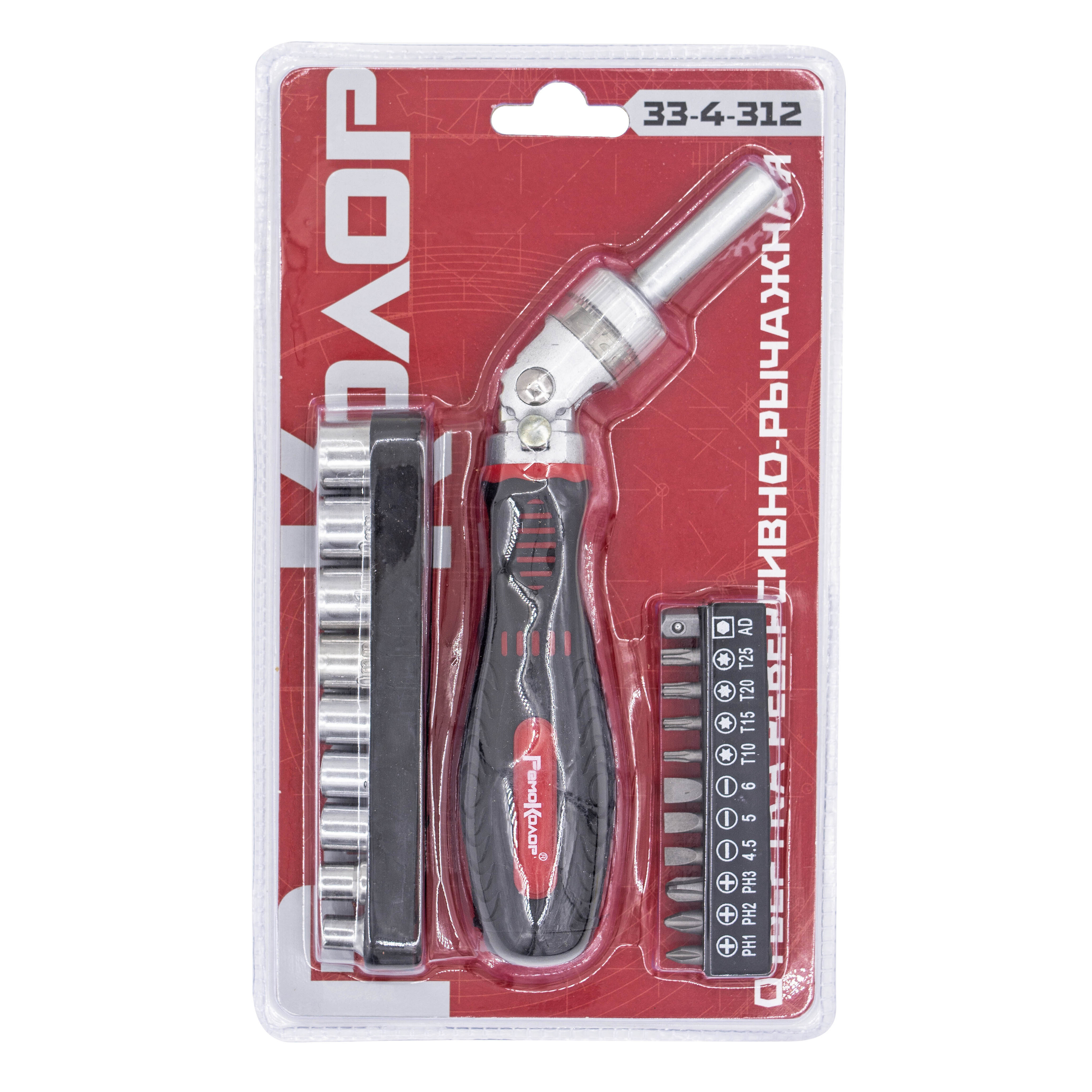 Предназначен для монтажа и демонтажа резьбовых соединений. Имеет поворотную головку для работы в труднодоступных местах под углом. Снабжена переключателем направления вращения с тремя положениями: закручивание, откручивание, фиксация, позволяющим одной рукой изменять направление вращения отвертки. для быстрой и эффективной работы. Игольчатые подшипники обеспечивают плавное вращение с небольшим сопротивлением и минимальным люфтом. Состав набора: Отверточная рукоятка с реверсивным механизмом - 1 шт.; Биты 1/4" х 25 мм 9 шт.: PH1, PH2, PH3, SL4.5, SL5, SL6, T10, T15, T20 Головки торцевые 1/4" 9 шт.: 5 мм, 6 мм, 7 мм, 8 мм, 9 мм, 10 мм, 11 мм, 12 мм, 13 мм Адаптер для головок 1/4"х25 мм - 1 шт. Материал: хромванадиевая сталь, двухкомпонентная рукоятка – пластик со вставками из термопластичной резины.