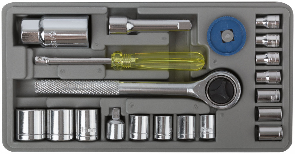 Головки торцевые 1/4": 4, 4.5, 5, 6, 7, 8, 9, 10, 11, 12, 138мм, 3/8": 14, 17, 19 мм. Вороток-трещотка реверсивная 190 мм (3/8"), переходник 3/8" - 1/4", удлинитель 70 мм (3/8"8-83/8"), отвертка-вороток 140 мм (1/4"), головка свечная 16 мм, зубчатый вкладыш для предварительного закручивания, пластиковый кейс.