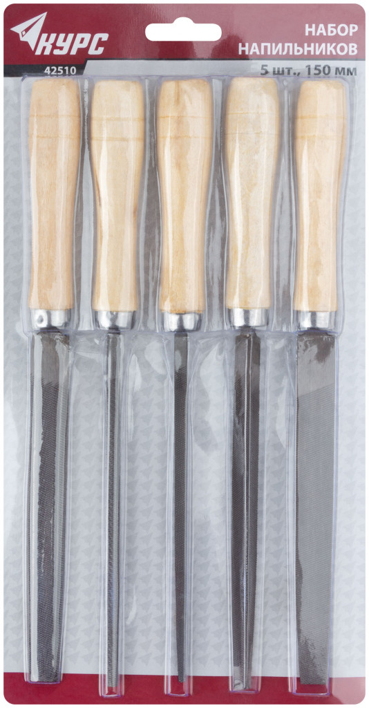 Набор 5 шт. Плоский, квадратный, трехгранный, круглый, полукруглый. Материал: инструментальная сталь, деревянная ручка. Упаковка: блистер.