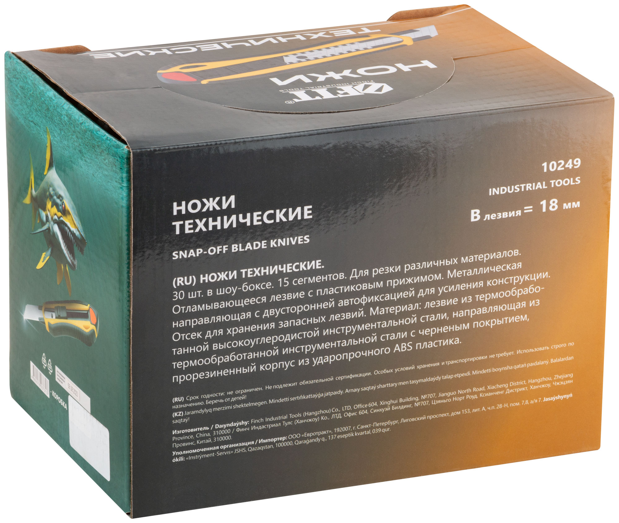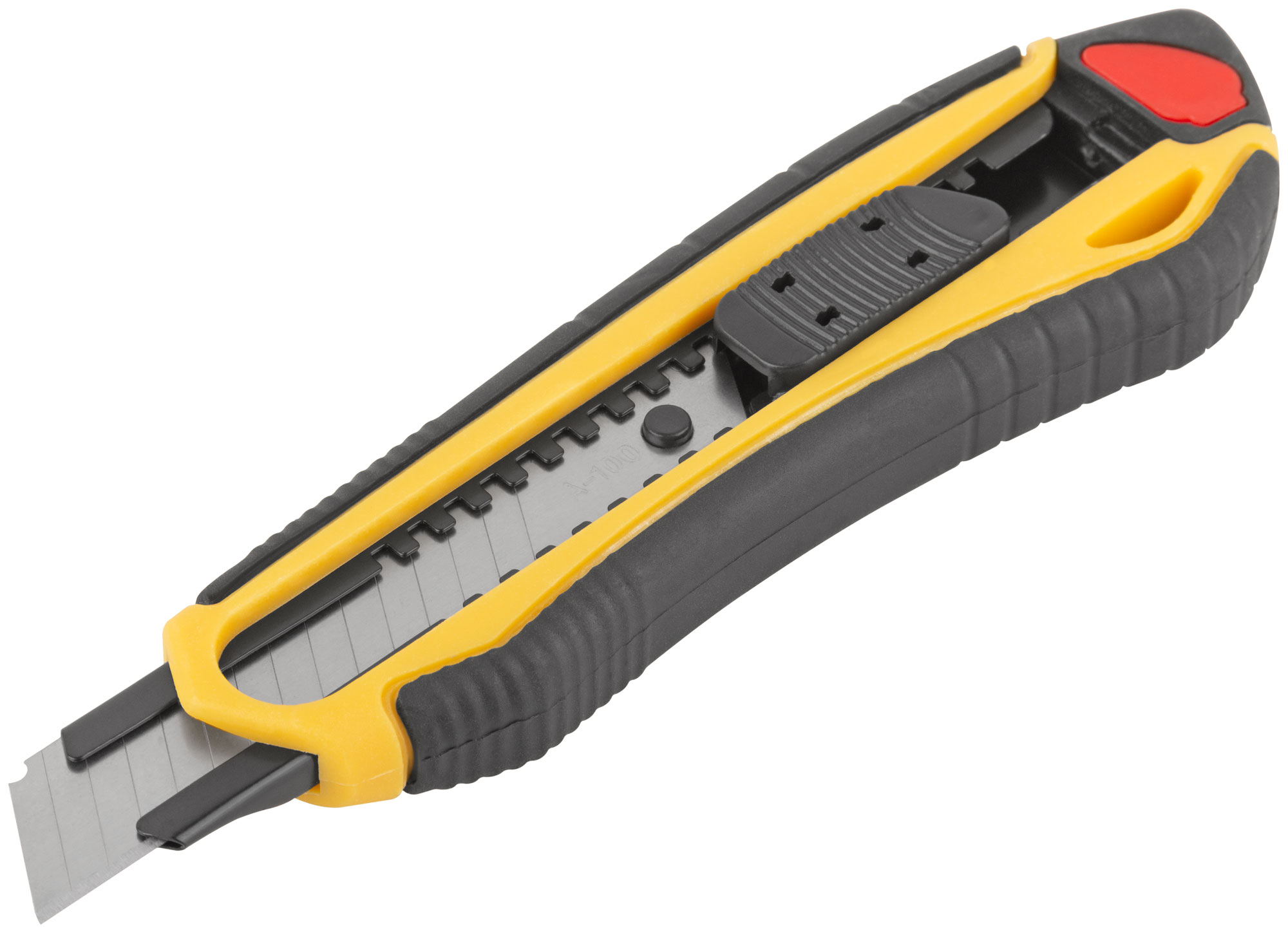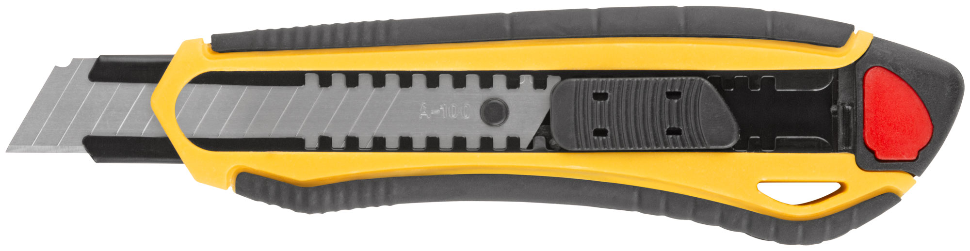 «Отламывающееся» лезвие с пластиковым прижимом. Металлическая направляющая с двусторонней автофиксацией для усиления конструкции. Отсек для хранения запасных лезвий. Материал: прорезиненный корпус из ударопрочного ABS пластика, лезвие из высоко-