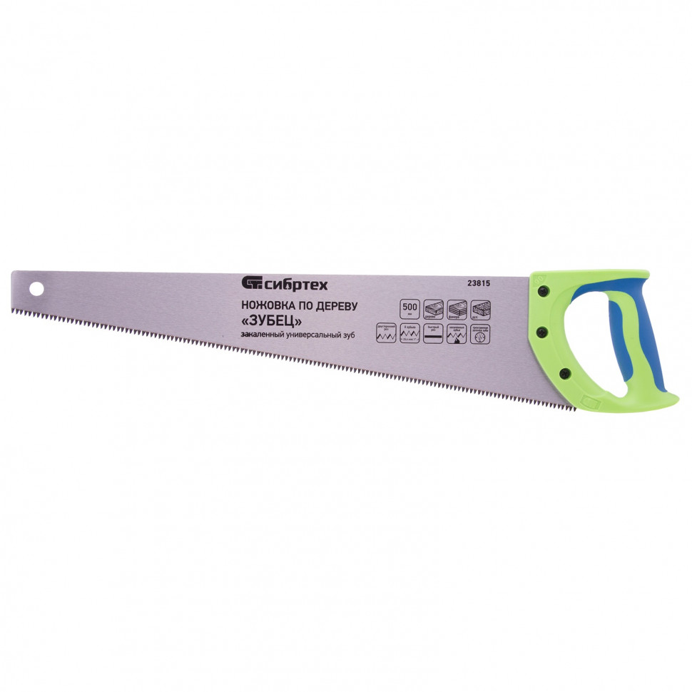 Ножовка Сибртех по дереву «Зубец» 23815 с полотном длиной 500 мм, калеными зубьями с 3D-заточкой и шагом 7-8 TPI, 2-компонентной рукояткой, предназначена для продольной и поперечной распиловки древесины, фанеры и ДСП. Инструмент обладает высокой производительностью благодаря зубьям с универсальным шагом 7-8 TPI и трехгранной заточке. Ножовка используется для выполнения столярных и плотницких работ, будет полезна в быту.