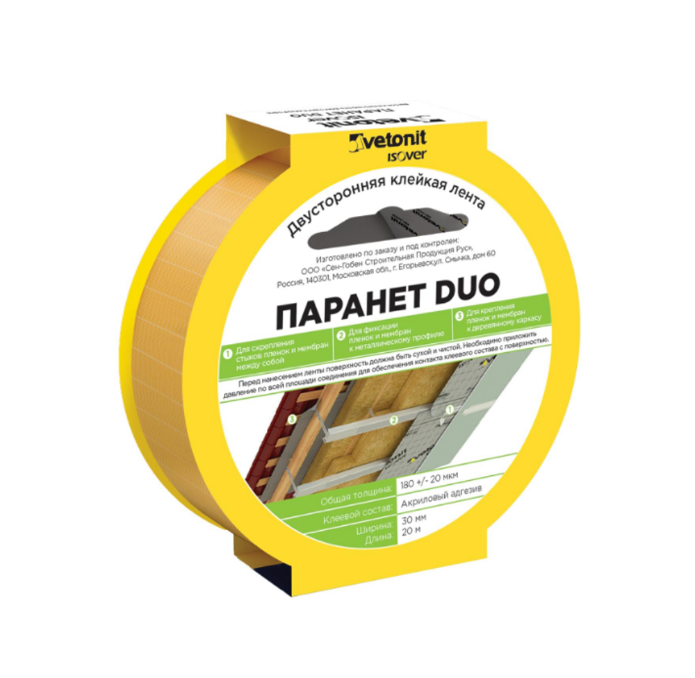Пароизоляционная клейкая лента двусторонняя Паранет ДУО // 30мм х 20м // VETONIT
