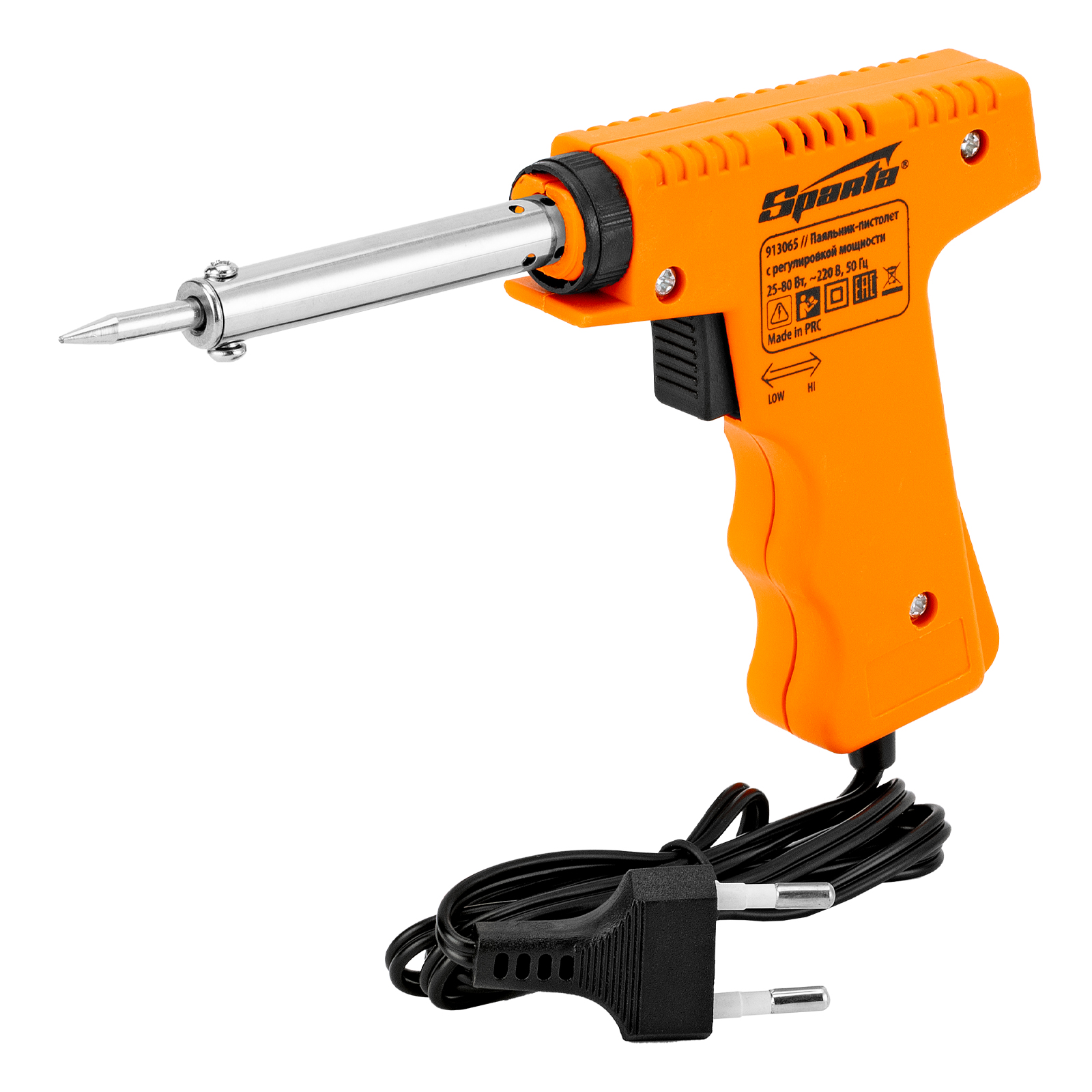 Паяльник-пистолет Sparta 913065 с регулировкой мощности в диапазоне 25-80 Вт питается от сети 220 В и предназначен для пайки микрочипов, транзисторов, электросхем, кабелей. Благодаря керамическому нагревательному элементу подходит для длительной непрерывной работы. Съемное жало может быть заменено в случае необходимости. Температура нагрева регулируется нажатием кнопки на рукоятке. Простой в применении прибор пригодится электромонтерам, радиолюбителям, автоэлектрикам, а также будет полезен в быту.
