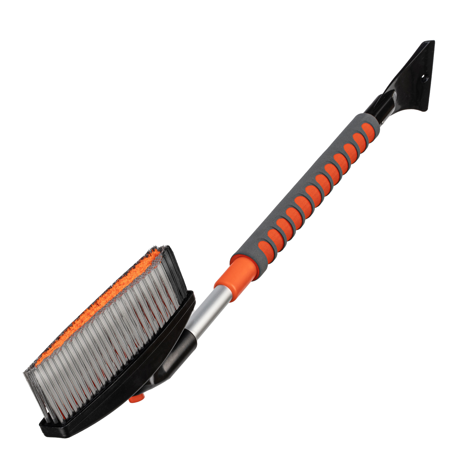 Щетка-скребок имеет плотную щетину, распушенную на концах, поэтому эффективно убирает слой снега, не царапая поверхность кузова.