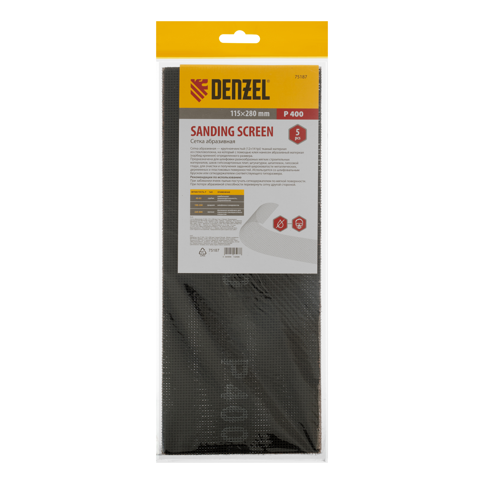 Абразивная сетка Denzel 75187, 115 х 280 мм, с зернистостью P 400, 5 шт. в упаковке, применяется для финишной обработки и придания гладкости зашпаклеванным поверхностям, а также твердой древесине и металлу. Она бережно снимает тонкий слой материала и лакокрасочного покрытия, удаляет ржавчину и заусенцы, сглаживает неровности. Абразивный слой обладает высоким ресурсом, т.к. зерна карбида кремния стачиваются медленно. Сетку устанавливают на ручные шлифовальные приспособления — бруски и сеткодержатели соответствующего типоразмера.