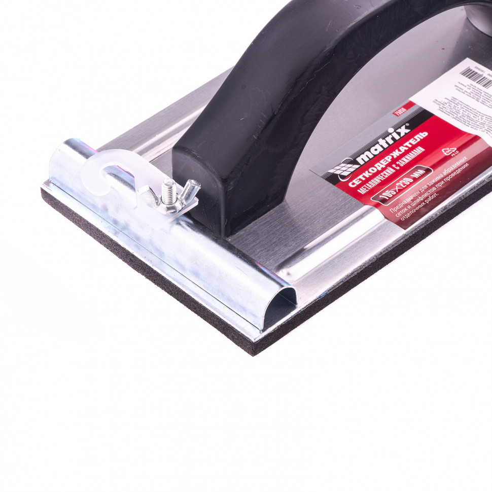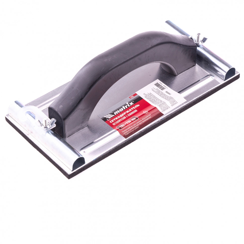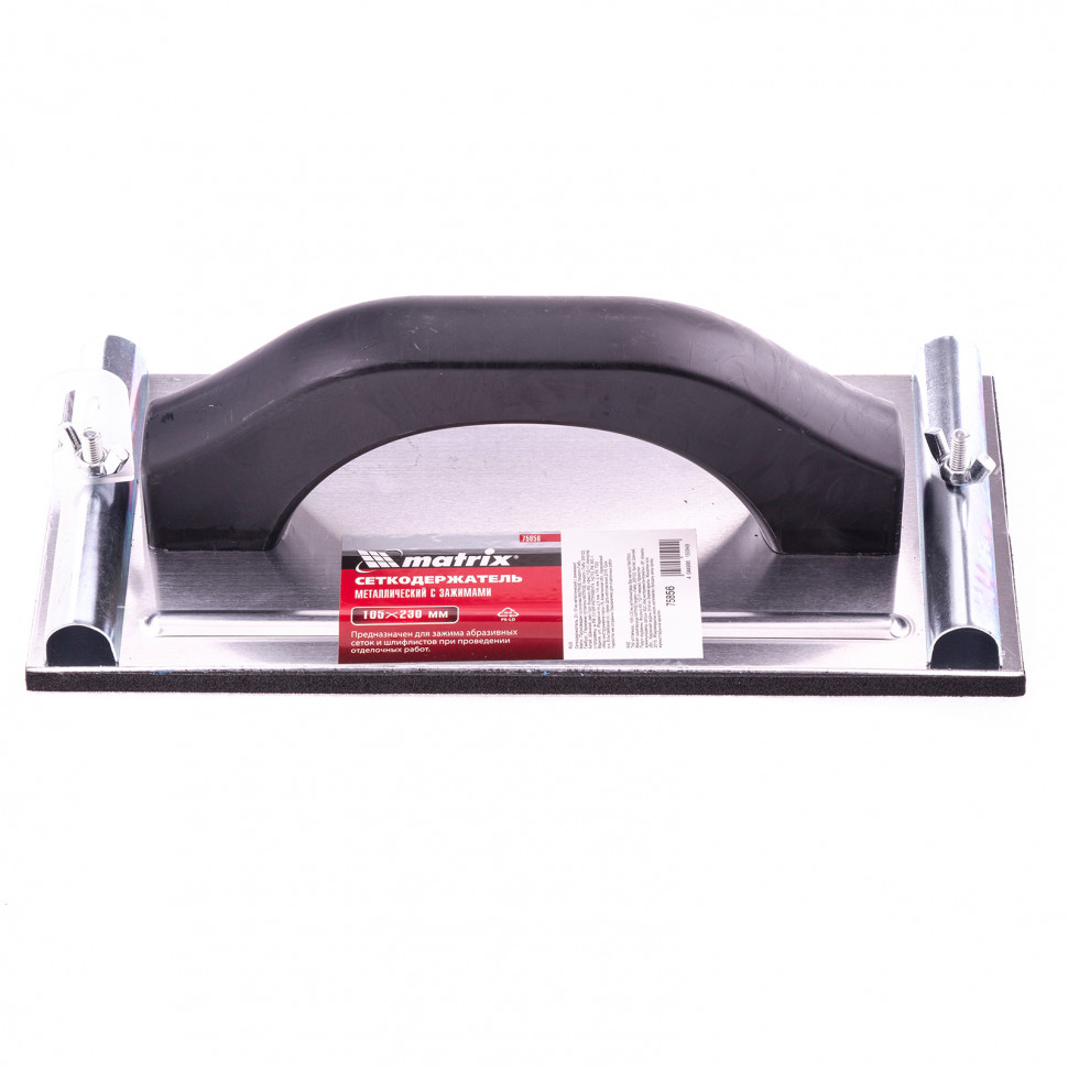 Сеткодержатель Matrix 75856, 230 х 105 мм, металлический с зажимами, используется для ручного шлифования деревянных, шпатлеванных, металлических, пластмассовых и прочих твердых поверхностей. Сеткодержатель фиксирует абразивную стеклосетку или шлифлист и позволяет удалять старые отделочные покрытия, подготавливать поверхность под покраску, а также выполнять чистовую обработку.