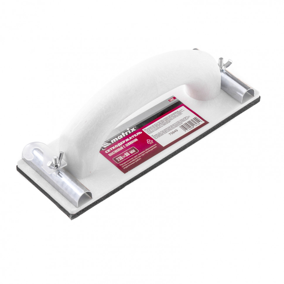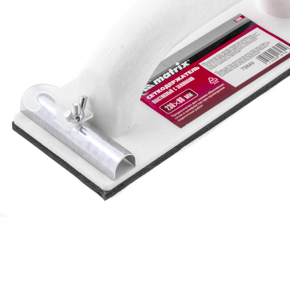 Сеткодержатель Matrix 75849, 230 х 80 мм, пластиковый с зажимами, используется для ручного шлифования деревянных, шпатлеванных, металлических, пластмассовых и прочих твердых поверхностей. Сеткодержатель фиксирует абразивную стеклосетку или шлифлист и позволяет удалять старые отделочные покрытия, подготавливать поверхность под покраску, а также выполнять чистовую обработку.